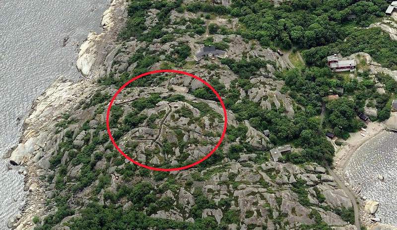 Noen meter til er tilgjengelig. På oversiktbilde er det grønne ryddet og det røde står igjen i det anlegget. Løpegravene nede på fortet er ikke så igjengrodd, men det er en del å ta tak i på odden ved stranda.