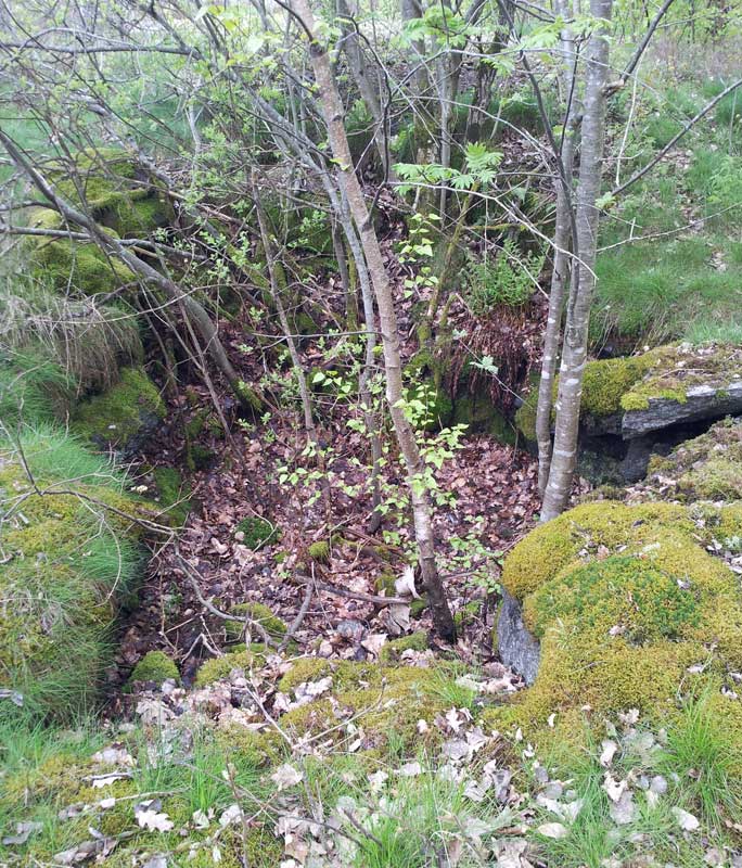 - Stort hull 4 x 3m, 1,5 - 2m dypt, mye sannsynlig påbegynt nedgang til fjellanlegg