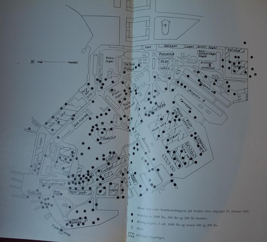 Vet ikke, men utfra det jeg har lest skulle den vel ligge inne på verftet? Iflg rapporten jeg postet utdrag fra ovenfor, ble den totalskadd i angrepet, som begrenset seg til området man ser på det siste bildet.Jon-Vegard wrote:Lå ikke den muligens inne på fastlandet, Sølvkronen/Strandpromenaden?