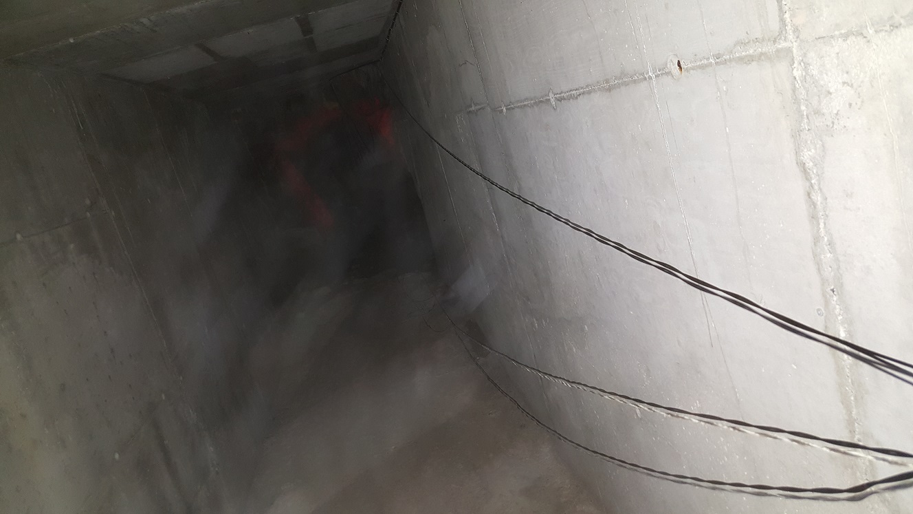 Hvis vi gikk rett frem så gikk det en veldig smal korridor i svak helling opp (massiv betong på begge sider), i svak venstresving og til slutt i kraftig venstresving oppfulgt av ei trapp. Lengre enn dette turte vi ikke å gå. Noen som vet om denne kanskje forbinnes med resten av fjellanlegget?