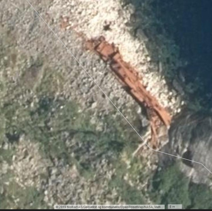 Vanskelig å si fra et slikt luftfoto, men det ligger jo en rusten Marinefährprahm ved Kiberg som evt kan benyttes til sammenligning (den er nesten dobbelt så lang, uten at det i seg selv er noe bevis mtp hvor mye som kan være forsvunnet fra vraket):Ole wrote:Muligens en slik:ØyBjugn wrote:Og e det noen som vet ka det e?!?