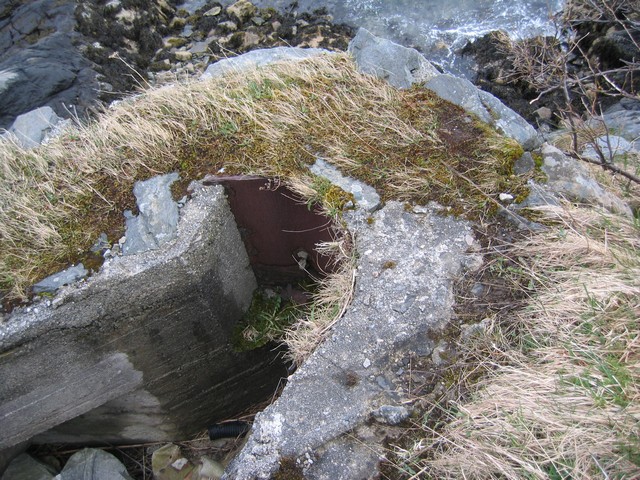 Om jeg ikke husker feil, står det en dato i juni 1942 i betongen. Etter Måløyraidet, mener å huske en aldri så liten blunder angående denne i den siste Måløyraid-boka....Jaja, mens Knut Ø koser seg på Gotteberghammeren tar jeg turen fra bunkeren under HV-huset til en liten bunker i fjellet rett over veien.