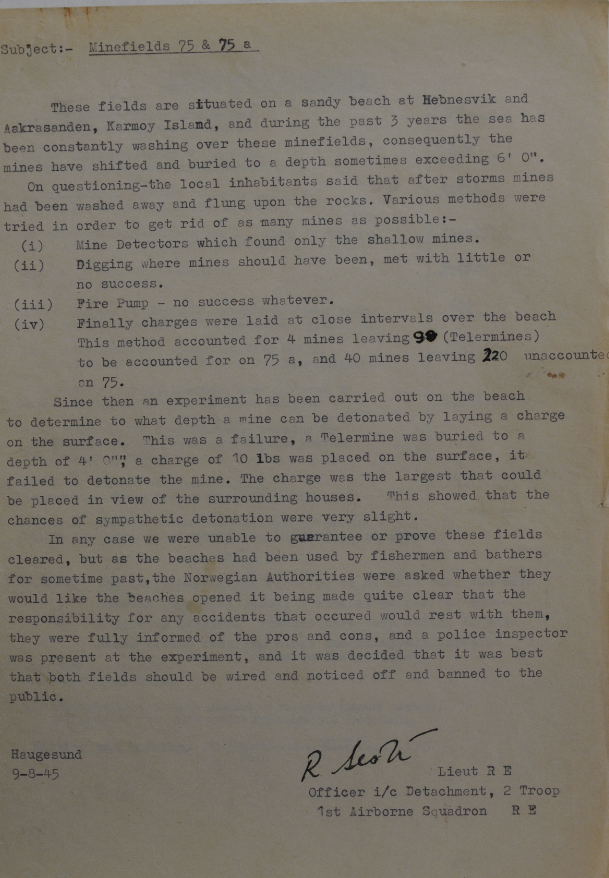 Jeg kan ikke finne mineryddesertifikatet fra disse feltene, men skal vi tro dette dokumentet (finnes bl. a. i linken til TommyG fra DKS) så manglet det 98 miner på Hebnesviken (75) og 220 miner på Åkrasanden (75a)...