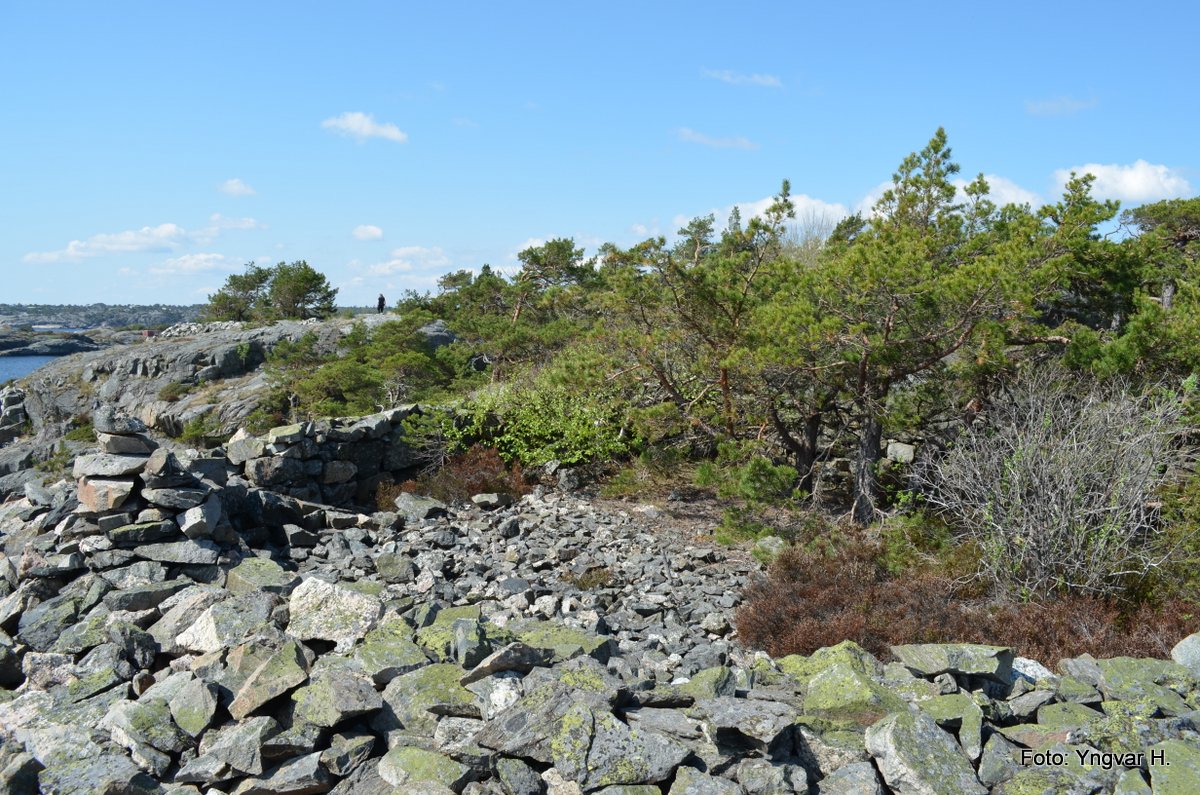Vi startet ved lyskasterstillingen og der var det en bunker, to mg stillinger, et flatt parti der det hadde stått en brakke. Det var bygget stier og anlagt piggtrådsperringer langs vannet, rundt hele øya. To hyggelige mennesker som hadde hytte der viste oss rundt.