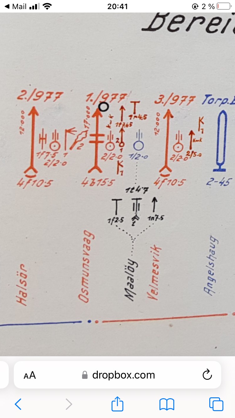 Stutzpunkt wrote: ↑01 Jan 2023 16:15 En oversikt på anlegg og avdelinger i Måløy rundt februar 1945, kryssene viser hvor det var planlagt å sette opp 2 cm og 3,7 cm Flak. (Utenom nummerne er det markert Infanteri(?)-støttepunktene "Nord" I, II, III samt "Stützpunkt Süd".