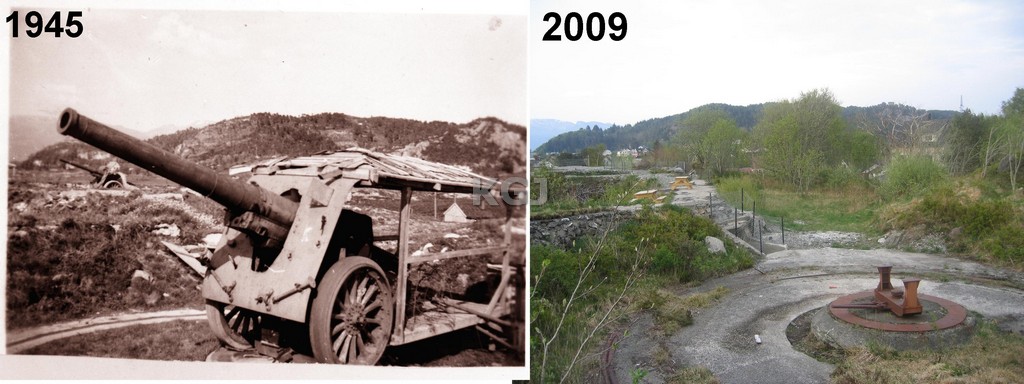 Her er et bilde fra nettsiden vår som viser et par av kanonene i 1945, og samme stilling i 2009. Der ser du at løpene står lenger fremme. En detalj som jeg la merke til først nå er at løpehjulet under løpet mangler på begge disse kanonene. Begge kanonene du ser på bildet er borte i dag. Den svarte kanonen som står igjen i dag står litt lenger bak og er ikke synlig i bildet, men den har løpehjulet intakt.
