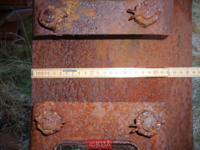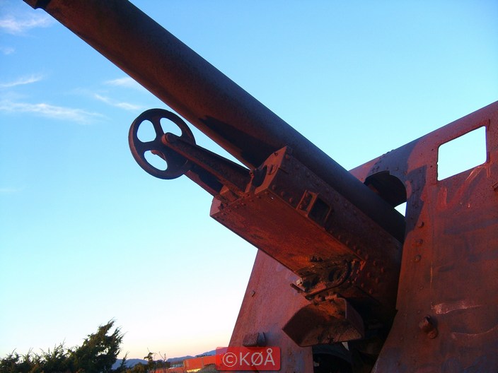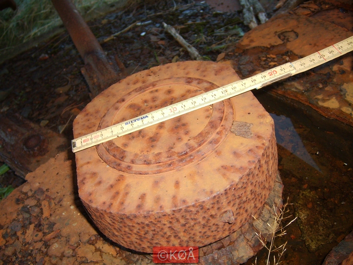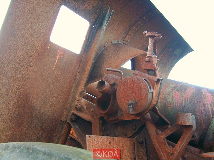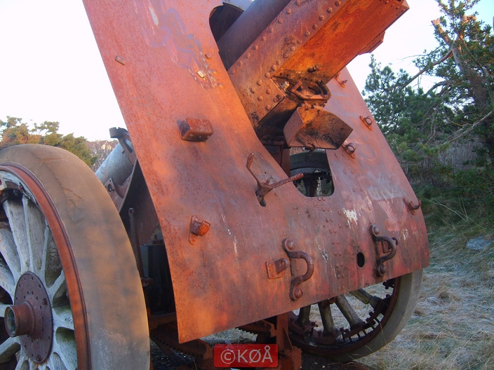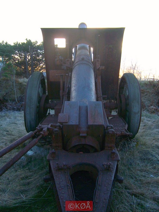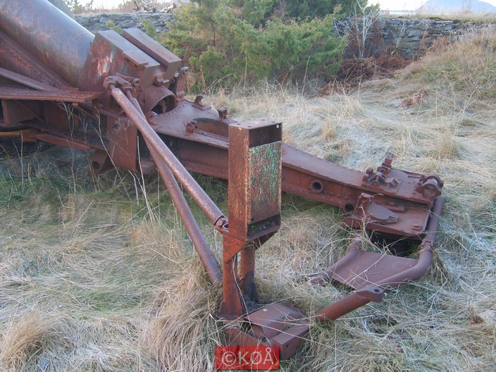 Her er bildene fra torsdag. Bildene er så som så, kompaktkamera i svinnende dagslys, ikke det beste utgangspunktet. Håper jeg har fått med det du lurte på. Har lagt en meterstokk på noen av bildene men vet ikke om det er mye hjelp i, perspektivet blir annerledes gjennom linsen og det ser ut som om meterstokken går utforbi kanten mens den egentlig ligger på kanten, eksempelvis. Men en får en viss idè om størrrelsesforhold. Ser denne kanonen er mer angrepet av rust enn jeg trodde, ikke bra....