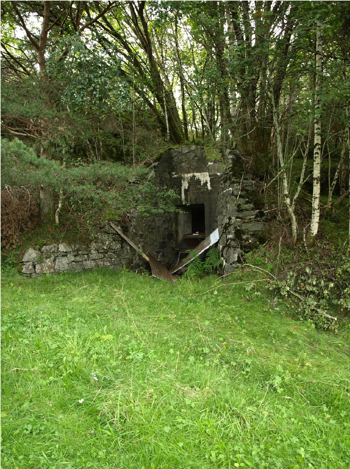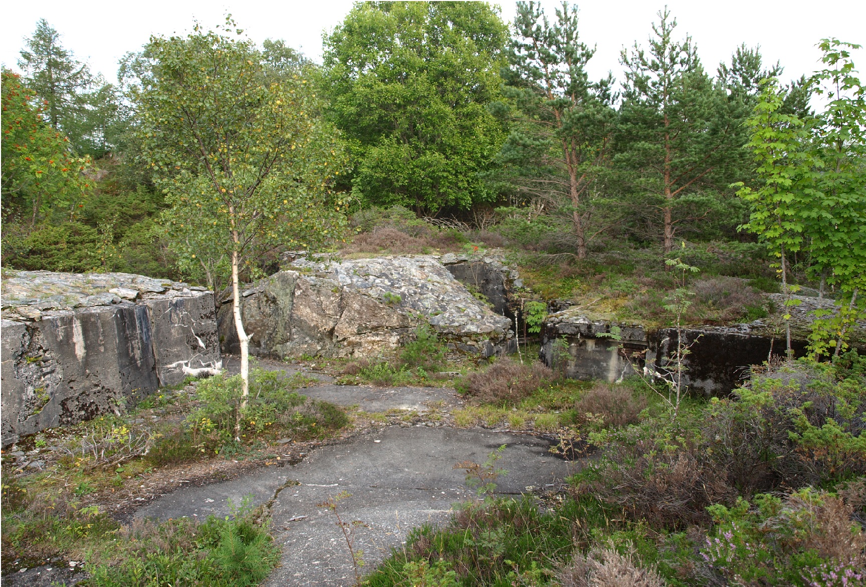 Dei første kanonane kom på plass på Storehaugen på Flokenes i oktober 1941 etter at tyskarane hadde bygt ein 1.100 meter lang veg til stillinga. Dei hadde mellombelse stillingar fram til årsskiftet, då fortet på Storehaugen stod ferdig. Fire franske 105 mm kanoner som kunne råke mål på 11.400 meters avtastand var hovudskytset, og elles strutta fortet av panservernkanoner, luftvernkanoner og mitraljøser. Her som på dei fleste forta sine, bygde tyskarane narrekanonar av tømmerstokkar og kryssfinér for å narre fienden.Frå Flokenes kunne tyskarane sperre innløpet til Førdefjorden og skyte mot sjømål på Stavfjorden. Kommandoplassen låg i ein bunker, og bakanfor stillingane vart det m.a. bygt mannskapsbrakker og kjøkken med messe. Truleg var det kring 88 offiserar og soldatar ved det tyske fortet på Flokenes. Her var det også planen å byggje eit større fjellanlegg, men dette vart ikkje tyskarane ferdige med før fortet vart nedlagt i april 1944 og batteriet overført til Blålid-fortet ved Måløy. Henta frå NRK-fylkesleksikon. Grottene er det igrunn ganske god størrelse på, reknar med det var desse dei ikkje vart ferdig med før fortet vart flytta i 44. Ellers hadde eg med sag og diverse som eg fjerna og rydda busker, tre og mose med. Naturen har begynt og ta overhånd her som mangen andre plassa