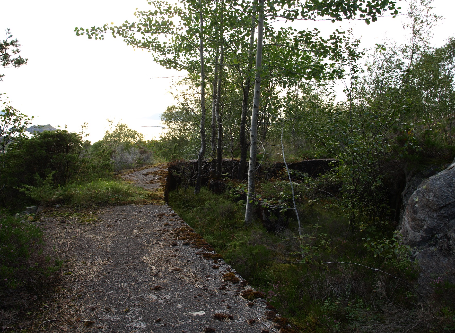 - Kanonstilling sett forfra. Luftvernkanon er 100m fram på høgre side. Ned til venstre er vegen til andre kanonstillingar, er også ein bunker bak på vensre side ned trappa