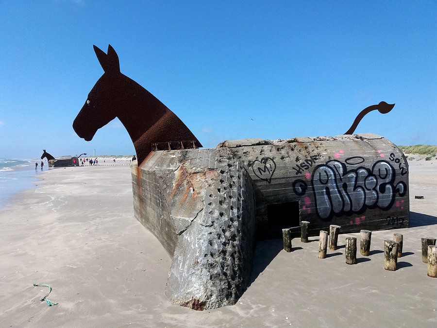 Sist ut i Blåvand ble "Bunker mules". Det er installasjon av Bill Woodrow fra 1995 for å markere at det var 50 år siden frigjøringen av Danmark i 1945. Fem F-Stand bunkere har fått påmontert hestehode og hestehale. Etter min mening en ganse artig "gjenbruk" av bunkerne fra krigen. Dette er bunkere i 1. Stellung Blaavand - Skallingen som bestod av fem F-Gruppen-stillinger. En F-Gruppen består av to stykk F-Stand flankerende kanonbunkere for MG. Disse er bygd med skyteskåret i hver sin retning med en Vf 58c Ringstand mellom. Vf 58c ble bygd for å dekke det som F-Stand ikke klarte å nå.