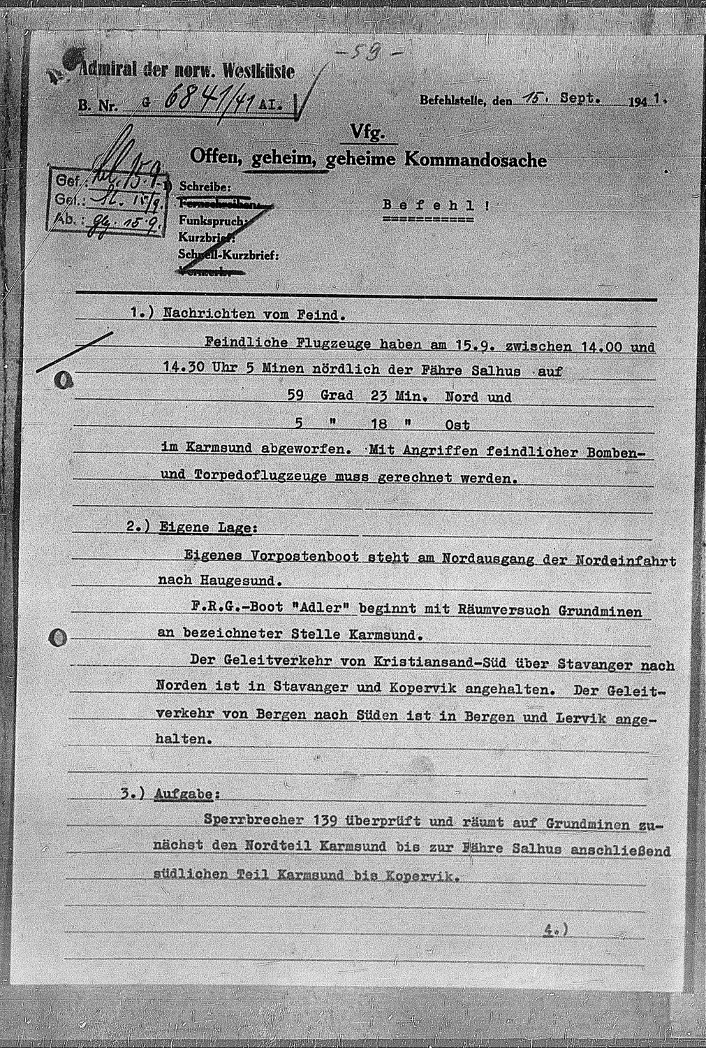 Fiendtlige fly har sluppet miner i Karmsundet 15 september 1941 iflg et tysk dokument.