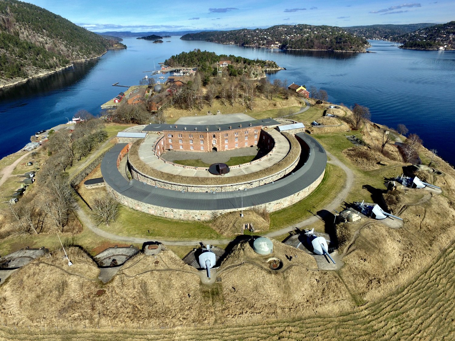Oscarsborg sett fra luften, kanonmuseet på venstre side i bilde. Guidene på museet er uniformert med sorte T-skjoret som på bilde under og disse kan kjøpes på nettet http://forsvaretsmuseer.no/Oscarsborg/H ... -skjortene